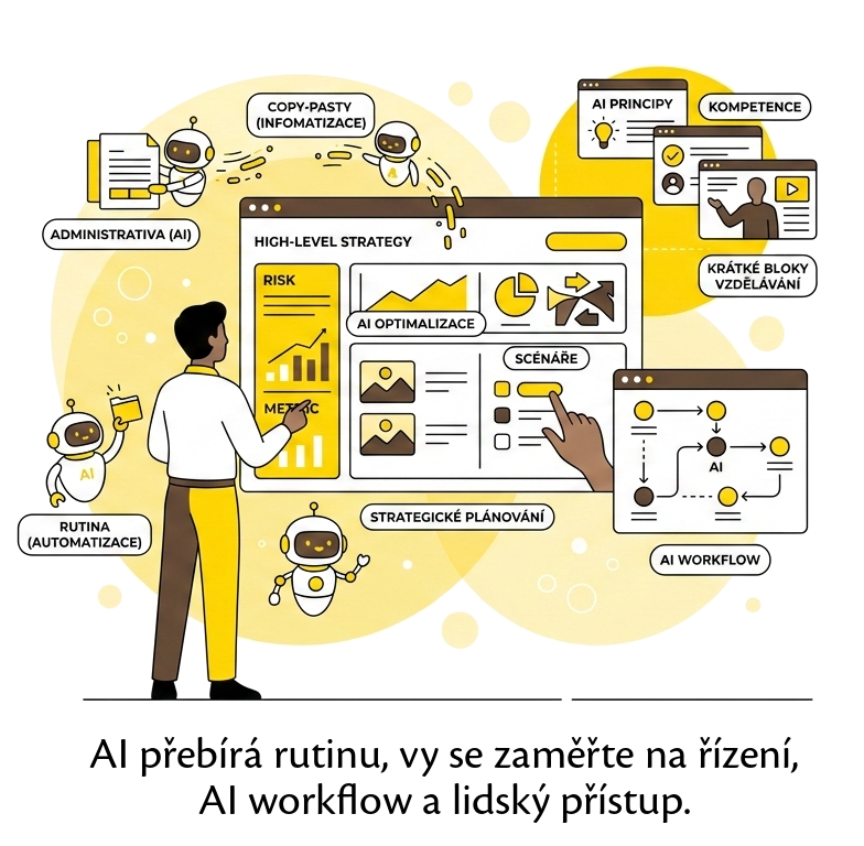 - V komunikaci AI přepíše schůzku a navrhne úkoly. Hodnota manažera je v tom, že nastaví jednoduché AI workflow, vyjedná závazky a zajistí odpovědnost.