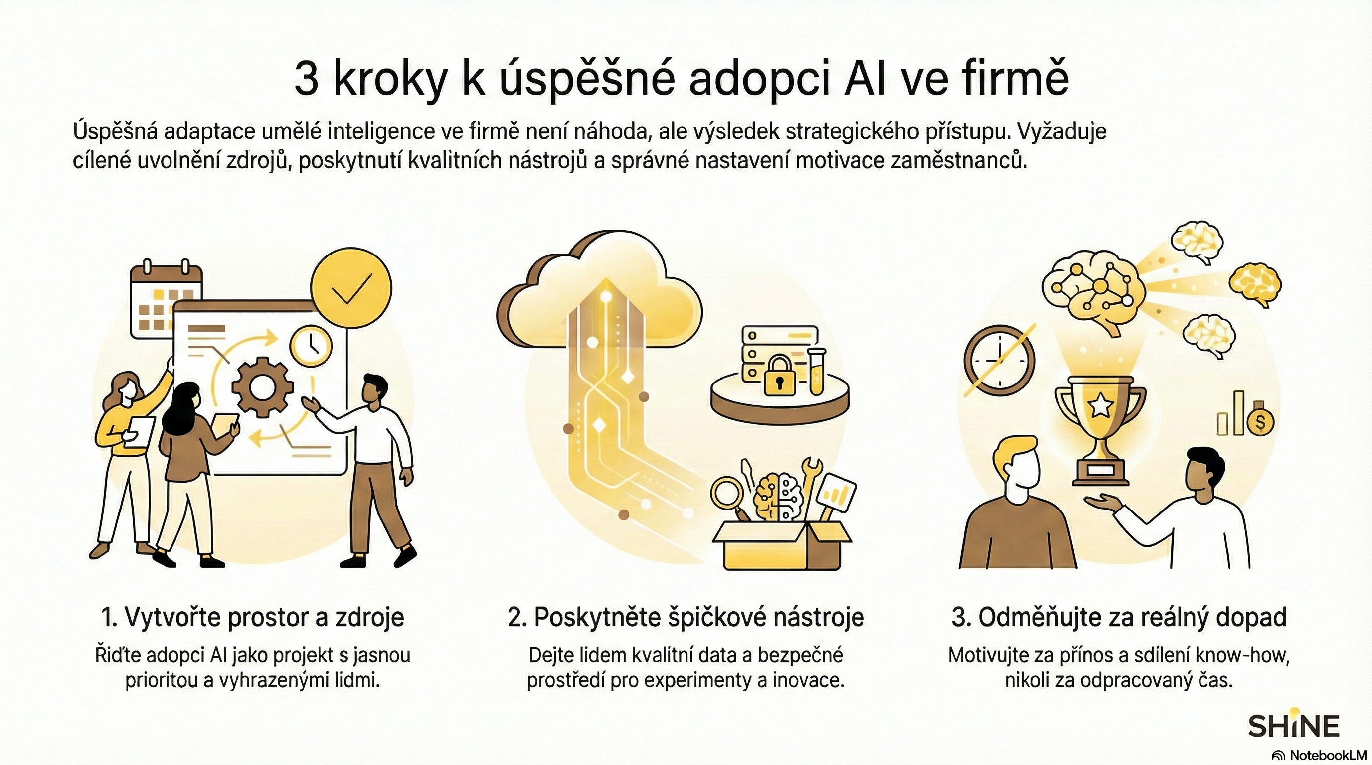 Moje zkušenost za posledních 5 let je jasná - online first + AI first všude, kde to dává smysl. A pak přichází skutečný game changer – motivace. Ve chvíli, kdy najdete odvahu přestat platit lidi, kteří to s AI skutečně umí, za odsezené hodiny a začnete je odměňovat za použitelné výsledky, produktivita vystřelí raketově nahoru.